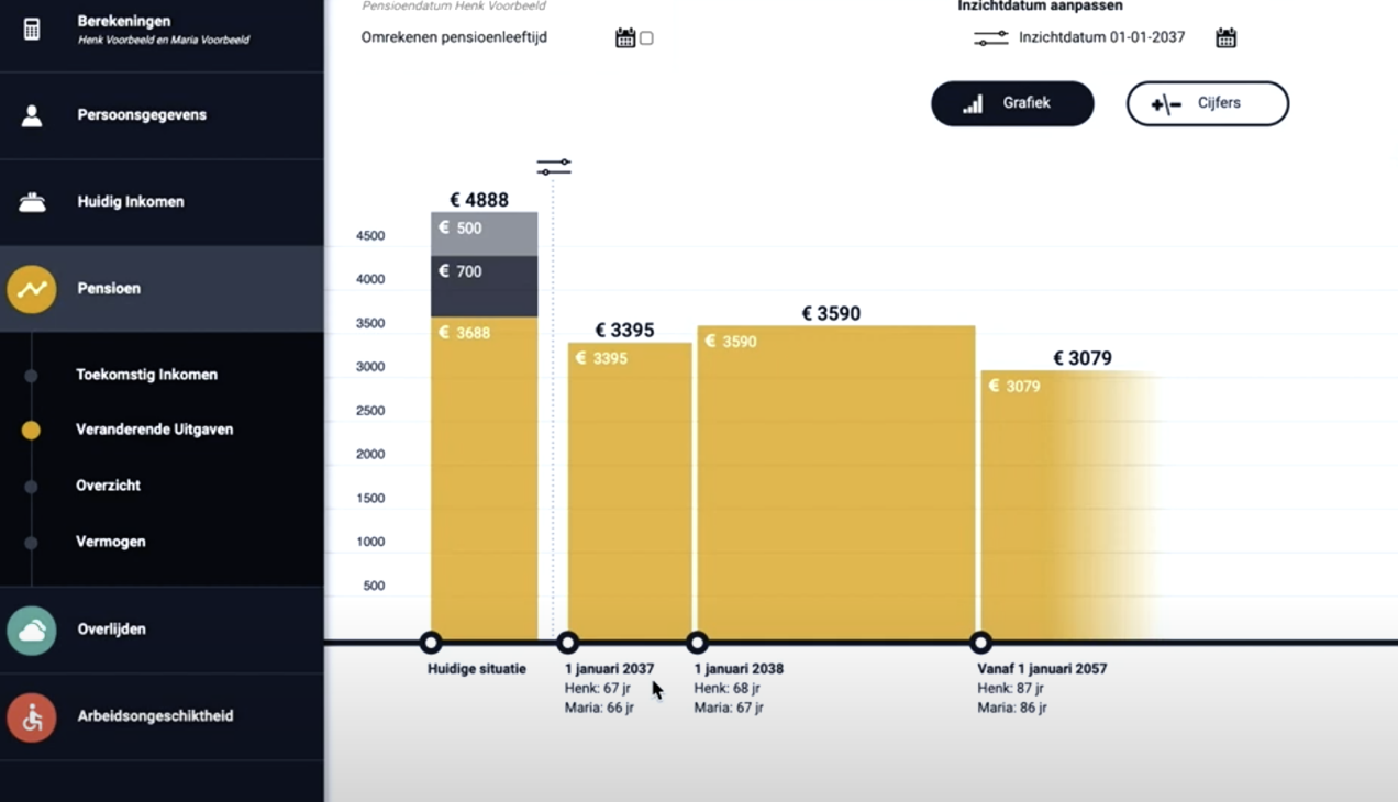Door slimme koppelingen met verschillende databronnen waaronder DigiD, bespaar je de klant en adviseur veel tijd. Hierdoor kan de adviseur gelijk starten met waar het echt om gaat. Namelijk: het inzichtelijk maken van de financiële situatie van de klant, en advies geven hoe bij pensioen, arbeidsongeschiktheid of overlijden van een partner de financiële situatie verbeterd kan worden.